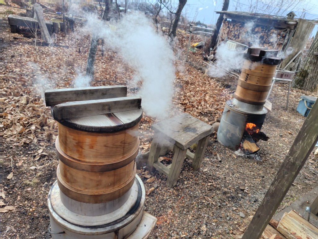 一晩水にさらした「もち米」を蒸す