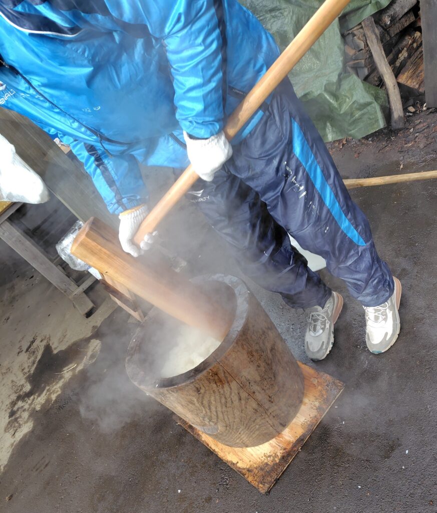 蒸したもち米を「臼と杵」で仕上げる!