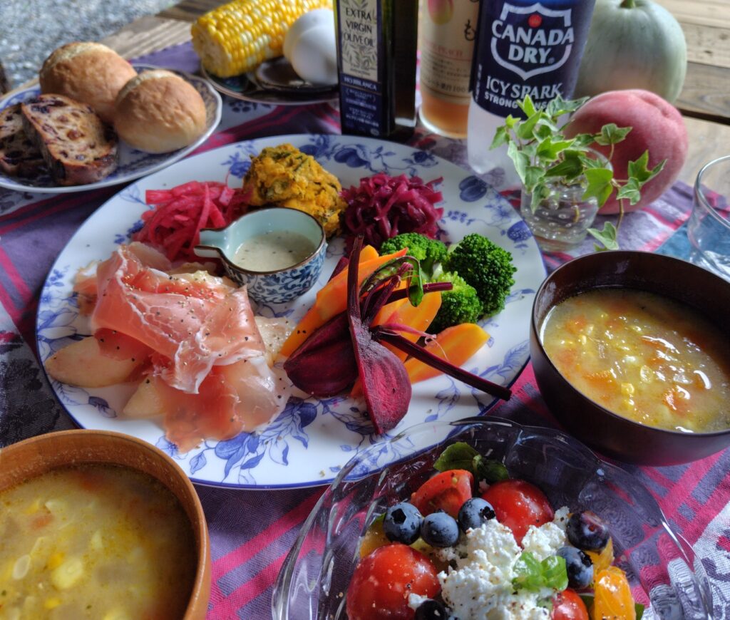 am7時半頃に朝採れ野菜たっぷりの朝食!
