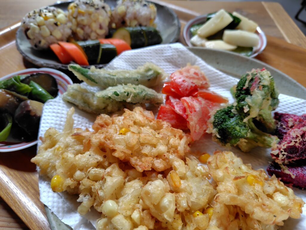 バター炒め、トウモロコシご飯、そして天ぷら(かきあげ)最高☆☆☆
